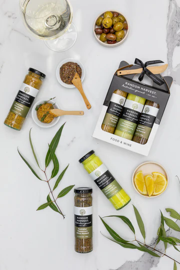 Peppercorn Shiraz Mustard: Mustard (41%), Canola Oil, Sugar, Wine, (5.0%), Pepper (3.4%), Salt, Vinegar, Water, Sunflower Lecithin. Contains 1% Alcohol. Australian Chardonnay Mustard: Mustard (32.4%), Sugar (7.9%), Vinegar, Salt, Wine (5.0%), (Herbs & Spices), Water, Contains 1% Alcohol. Chardonnay Lemon Dressing: Canola Oil, Water, Lemon Juice (18%), Chardonnay Wine (11%), Vinegar, Sugar, Garlic, Ginger, Salt, Vegetable Gum (Xanthan), Turmeric, Pepper, Rosemary Extract.
