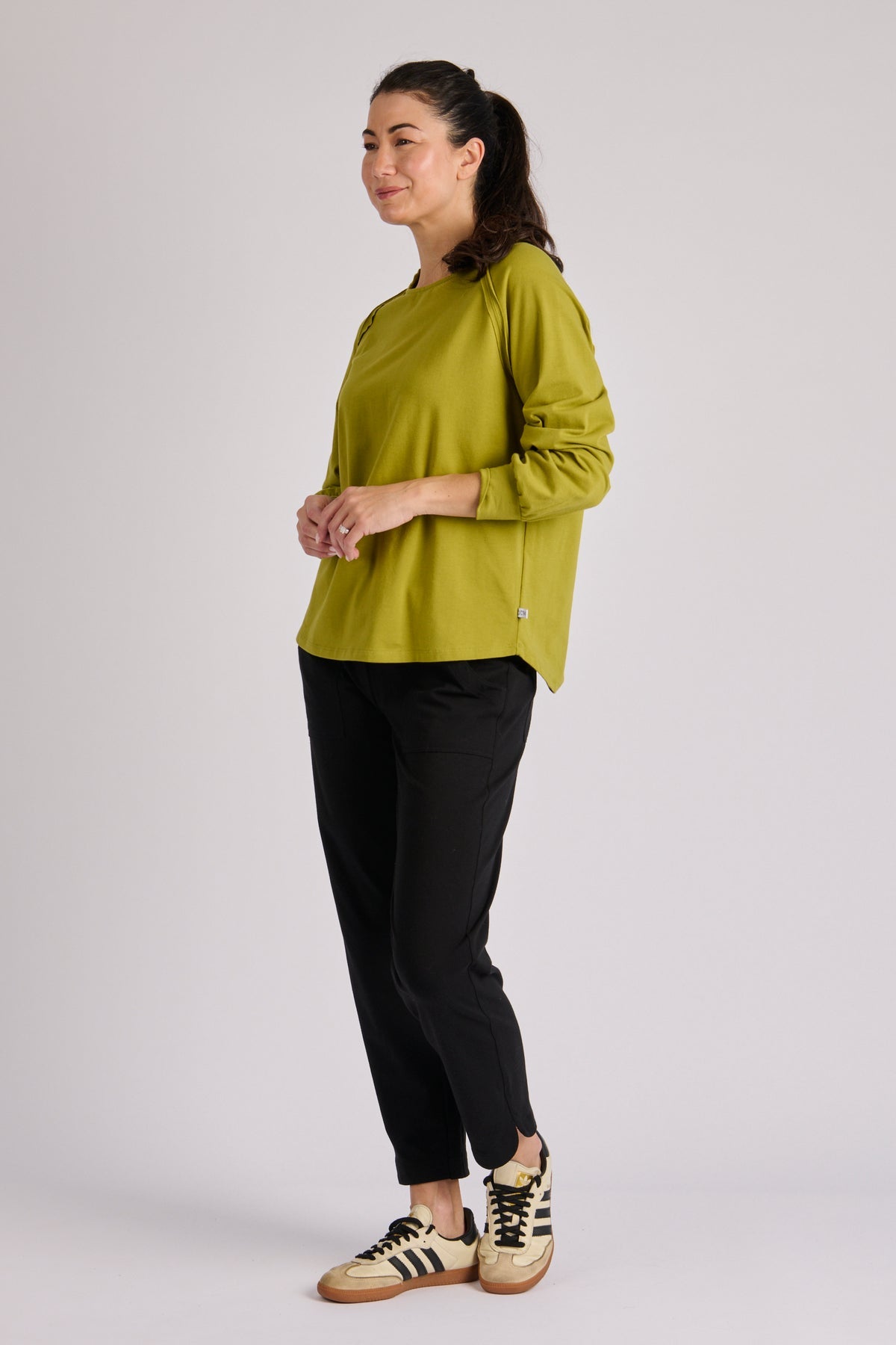 Design: Relaxed long sleeve silhouette with raglan sleeve and subtle collar detail
