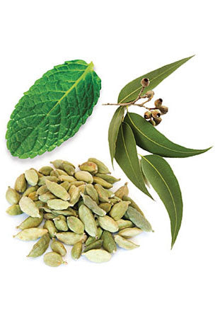 Laurel Leaf, Eucalyptus Leaf, Peppermint Plant, Melaleuca Leaf, Lemon Peel, Cardamom Seed, Ravintsara Leaf and Ravensara Leaf essential oils